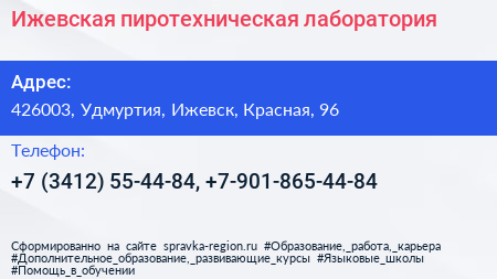 Ижевская пиротехническая лаборатория по адресу 426003, Удмуртия, Ижевск, Красная, 96 в дальнейшем Организация, размещена в следующих категориях: