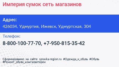 Империя сумок, сеть магазинов по адресу 426034, Удмуртия, Ижевск, Удмуртская, 304 в дальнейшем Организация, размещена в следующих категориях: