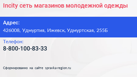 Incity, сеть магазинов молодежной одежды по адресу 426008, Удмуртия, Ижевск, Удмуртская, 255Б в дальнейшем Организация, размещена в следующих категориях: