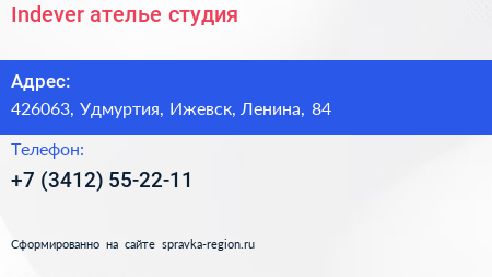 Indever, ателье-студия по адресу 426063, Удмуртия, Ижевск, Ленина, 84 в дальнейшем Организация, размещена в следующих категориях:
