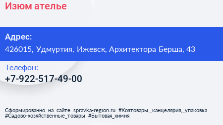 Изюм, ателье по адресу 426015, Удмуртия, Ижевск, Архитектора Берша, 43 в дальнейшем Организация, размещена в следующих категориях: