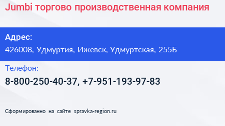 Jumbi, торгово-производственная компания по адресу 426008, Удмуртия, Ижевск, Удмуртская, 255Б в дальнейшем Организация, размещена в следующих категориях:
