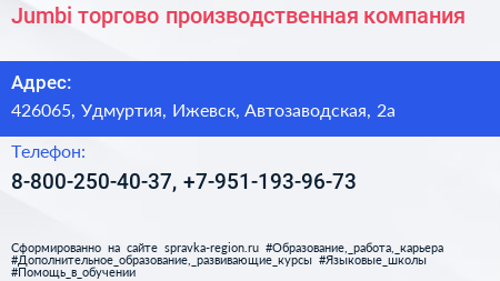 Jumbi, торгово-производственная компания по адресу 426065, Удмуртия, Ижевск, Автозаводская, 2а в дальнейшем Организация, размещена в следующих категориях: