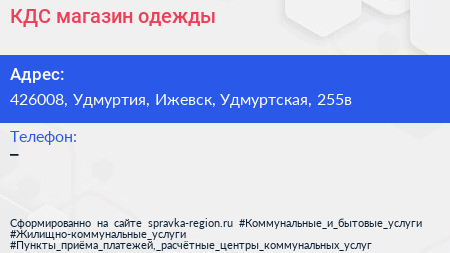 КДС, магазин одежды по адресу 426008, Удмуртия, Ижевск, Удмуртская, 255в в дальнейшем Организация, размещена в следующих категориях: