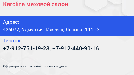 Karolina, меховой салон по адресу 426072, Удмуртия, Ижевск, Ленина, 144 к3 в дальнейшем Организация, размещена в следующих категориях: