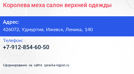 Королева меха, салон верхней одежды по адресу 426072, Удмуртия, Ижевск, Ленина, 140 в дальнейшем Организация, размещена в следующих категориях: