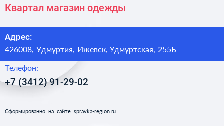 Квартал, магазин одежды по адресу 426008, Удмуртия, Ижевск, Удмуртская, 255Б в дальнейшем Организация, размещена в следующих категориях: