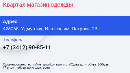 Квартал, магазин одежды по адресу 426068, Удмуртия, Ижевск, им. Петрова, 29 в дальнейшем Организация, размещена в следующих категориях: