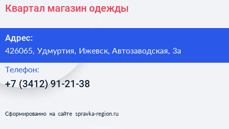 Квартал, магазин одежды по адресу 426065, Удмуртия, Ижевск, Автозаводская, 3а в дальнейшем Организация, размещена в следующих категориях: