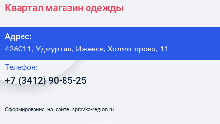 Квартал, магазин одежды по адресу 426011, Удмуртия, Ижевск, Холмогорова, 11 в дальнейшем Организация, размещена в следующих категориях: