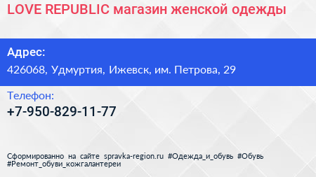 LOVE REPUBLIC, магазин женской одежды по адресу 426068, Удмуртия, Ижевск, им. Петрова, 29 в дальнейшем Организация, размещена в следующих категориях: