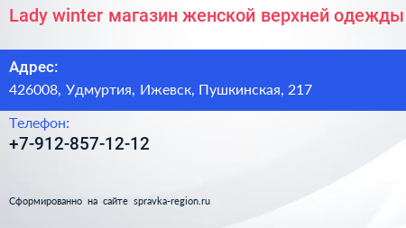 Lady winter, магазин женской верхней одежды по адресу 426008, Удмуртия, Ижевск, Пушкинская, 217 в дальнейшем Организация, размещена в следующих категориях: