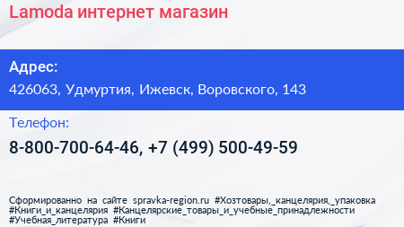 Lamoda, интернет-магазин по адресу 426063, Удмуртия, Ижевск, Воровского, 143 в дальнейшем Организация, размещена в следующих категориях: