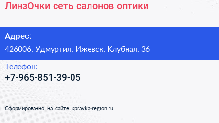 ЛинзОчки, сеть салонов оптики по адресу 426006, Удмуртия, Ижевск, Клубная, 36 в дальнейшем Организация, размещена в следующих категориях: