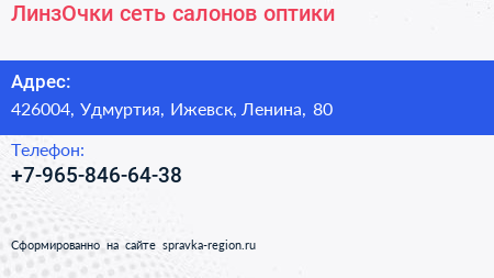 ЛинзОчки, сеть салонов оптики по адресу 426004, Удмуртия, Ижевск, Ленина, 80 в дальнейшем Организация, размещена в следующих категориях: