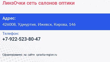 ЛинзОчки, сеть салонов оптики по адресу 426008, Удмуртия, Ижевск, Кирова, 146 в дальнейшем Организация, размещена в следующих категориях: