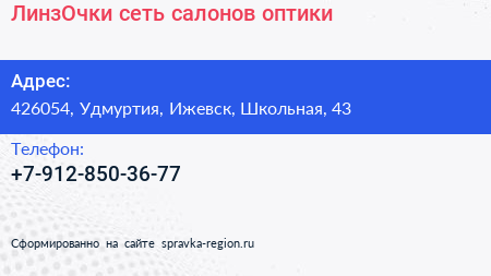 ЛинзОчки, сеть салонов оптики по адресу 426054, Удмуртия, Ижевск, Школьная, 43 в дальнейшем Организация, размещена в следующих категориях: