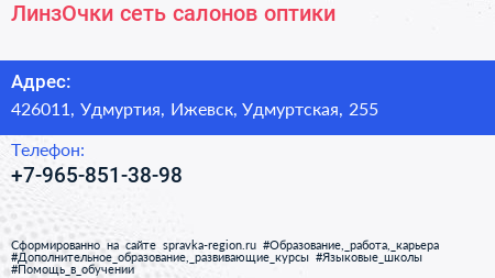 ЛинзОчки, сеть салонов оптики по адресу 426011, Удмуртия, Ижевск, Удмуртская, 255 в дальнейшем Организация, размещена в следующих категориях: