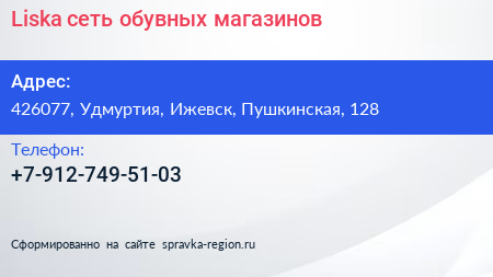 Liska, сеть обувных магазинов по адресу 426077, Удмуртия, Ижевск, Пушкинская, 128 в дальнейшем Организация, размещена в следующих категориях: