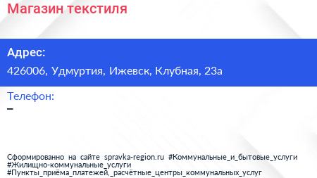 Магазин текстиля по адресу 426006, Удмуртия, Ижевск, Клубная, 23а в дальнейшем Организация, размещена в следующих категориях:
