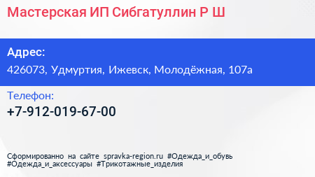 Мастерская, ИП Сибгатуллин Р.Ш. по адресу 426073, Удмуртия, Ижевск, Молодёжная, 107а в дальнейшем Организация, размещена в следующих категориях: