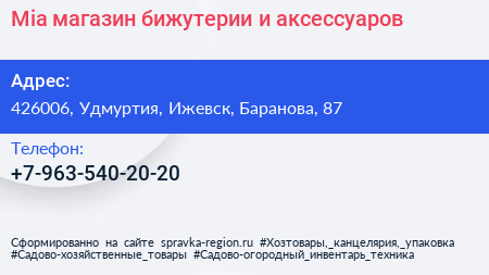 Mia, магазин бижутерии и аксессуаров по адресу 426006, Удмуртия, Ижевск, Баранова, 87 в дальнейшем Организация, размещена в следующих категориях: