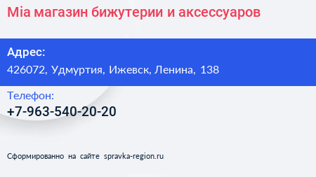 Mia, магазин бижутерии и аксессуаров по адресу 426072, Удмуртия, Ижевск, Ленина, 138 в дальнейшем Организация, размещена в следующих категориях: