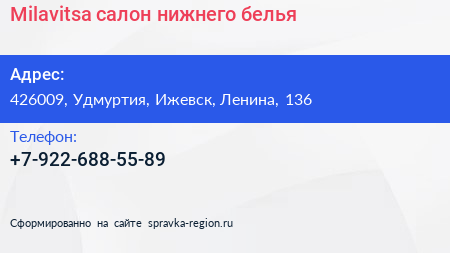 Milavitsa, салон нижнего белья по адресу 426009, Удмуртия, Ижевск, Ленина, 136 в дальнейшем Организация, размещена в следующих категориях: