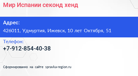 Мир Испании, секонд-хенд по адресу 426011, Удмуртия, Ижевск, 10 лет Октября, 51 в дальнейшем Организация, размещена в следующих категориях: