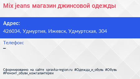 Mix jeans, магазин джинсовой одежды по адресу 426034, Удмуртия, Ижевск, Удмуртская, 304 в дальнейшем Организация, размещена в следующих категориях: