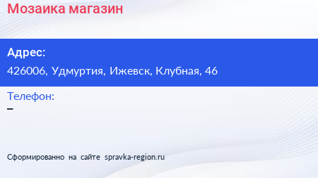 Мозаика, магазин по адресу 426006, Удмуртия, Ижевск, Клубная, 46 в дальнейшем Организация, размещена в следующих категориях: