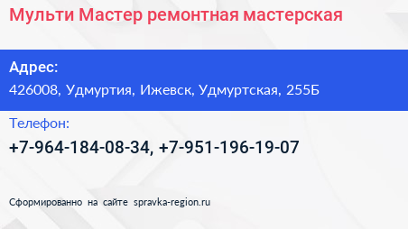 Мульти Мастер, ремонтная мастерская по адресу 426008, Удмуртия, Ижевск, Удмуртская, 255Б в дальнейшем Организация, размещена в следующих категориях: