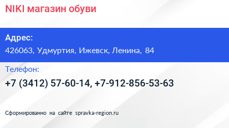 NIKI, магазин обуви по адресу 426063, Удмуртия, Ижевск, Ленина, 84 в дальнейшем Организация, размещена в следующих категориях: