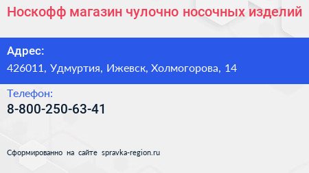 Носкофф, магазин чулочно-носочных изделий по адресу 426011, Удмуртия, Ижевск, Холмогорова, 14 в дальнейшем Организация, размещена в следующих категориях: