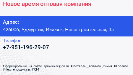 Новое время, оптовая компания по адресу 426006, Удмуртия, Ижевск, Новостроительная, 35 в дальнейшем Организация, размещена в следующих категориях:
