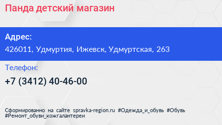 Панда, детский магазин по адресу 426011, Удмуртия, Ижевск, Удмуртская, 263 в дальнейшем Организация, размещена в следующих категориях: