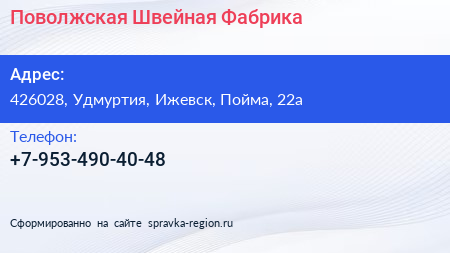 Поволжская Швейная Фабрика по адресу 426028, Удмуртия, Ижевск, Пойма, 22а в дальнейшем Организация, размещена в следующих категориях: