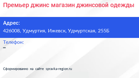 Премьер джинс, магазин джинсовой одежды по адресу 426008, Удмуртия, Ижевск, Удмуртская, 255Б в дальнейшем Организация, размещена в следующих категориях:
