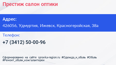 Престиж, салон оптики по адресу 426056, Удмуртия, Ижевск, Красногеройская, 38а в дальнейшем Организация, размещена в следующих категориях: