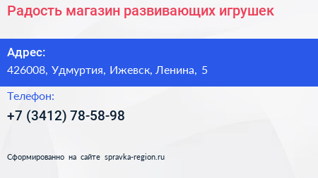 Радость, магазин развивающих игрушек по адресу 426008, Удмуртия, Ижевск, Ленина, 5 в дальнейшем Организация, размещена в следующих категориях: