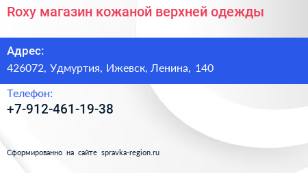 Roxy, магазин кожаной верхней одежды по адресу 426072, Удмуртия, Ижевск, Ленина, 140 в дальнейшем Организация, размещена в следующих категориях: