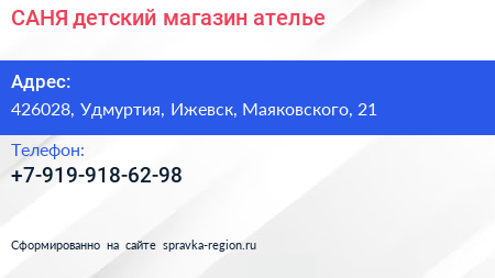САНЯ, детский магазин-ателье по адресу 426028, Удмуртия, Ижевск, Маяковского, 21 в дальнейшем Организация, размещена в следующих категориях: