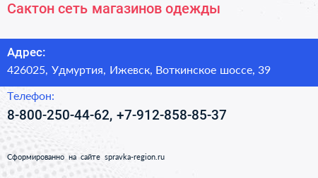 Сактон, сеть магазинов одежды по адресу 426025, Удмуртия, Ижевск, Воткинское шоссе, 39 в дальнейшем Организация, размещена в следующих категориях: