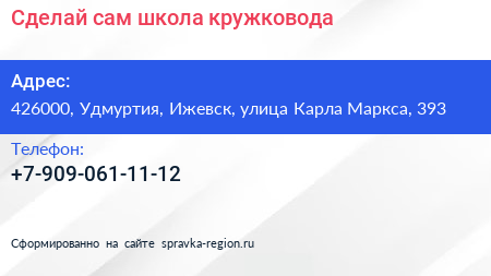 Сделай сам, школа кружковода по адресу 426000, Удмуртия, Ижевск, улица Карла Маркса, 393 в дальнейшем Организация, размещена в следующих категориях: