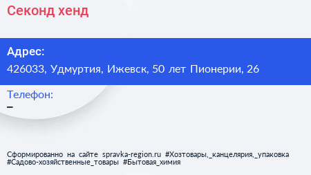Секонд-хенд по адресу 426033, Удмуртия, Ижевск, 50 лет Пионерии, 26 в дальнейшем Организация, размещена в следующих категориях:
