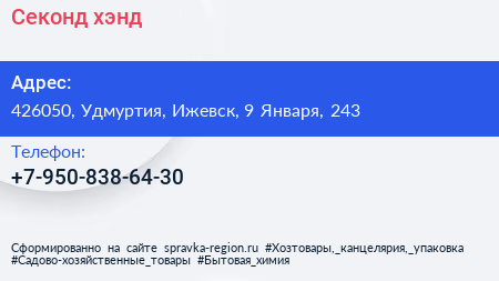 Секонд хэнд по адресу 426050, Удмуртия, Ижевск, 9 Января, 243 в дальнейшем Организация, размещена в следующих категориях: