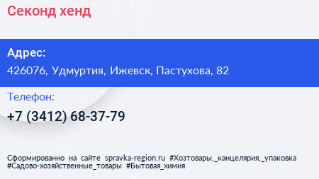Секонд-хенд по адресу 426076, Удмуртия, Ижевск, Пастухова, 82 в дальнейшем Организация, размещена в следующих категориях: