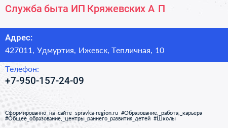 Служба быта, ИП Кряжевских А.П. по адресу 427011, Удмуртия, Ижевск, Тепличная, 10 в дальнейшем Организация, размещена в следующих категориях: