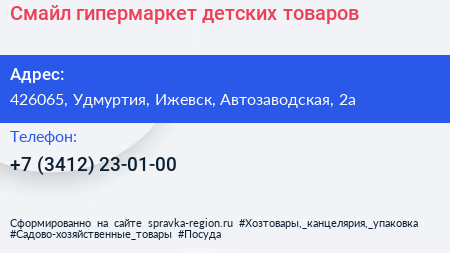 Смайл, гипермаркет детских товаров по адресу 426065, Удмуртия, Ижевск, Автозаводская, 2а в дальнейшем Организация, размещена в следующих категориях: