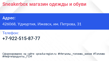Sneakerbox, магазин одежды и обуви по адресу 426068, Удмуртия, Ижевск, им. Петрова, 31 в дальнейшем Организация, размещена в следующих категориях:
